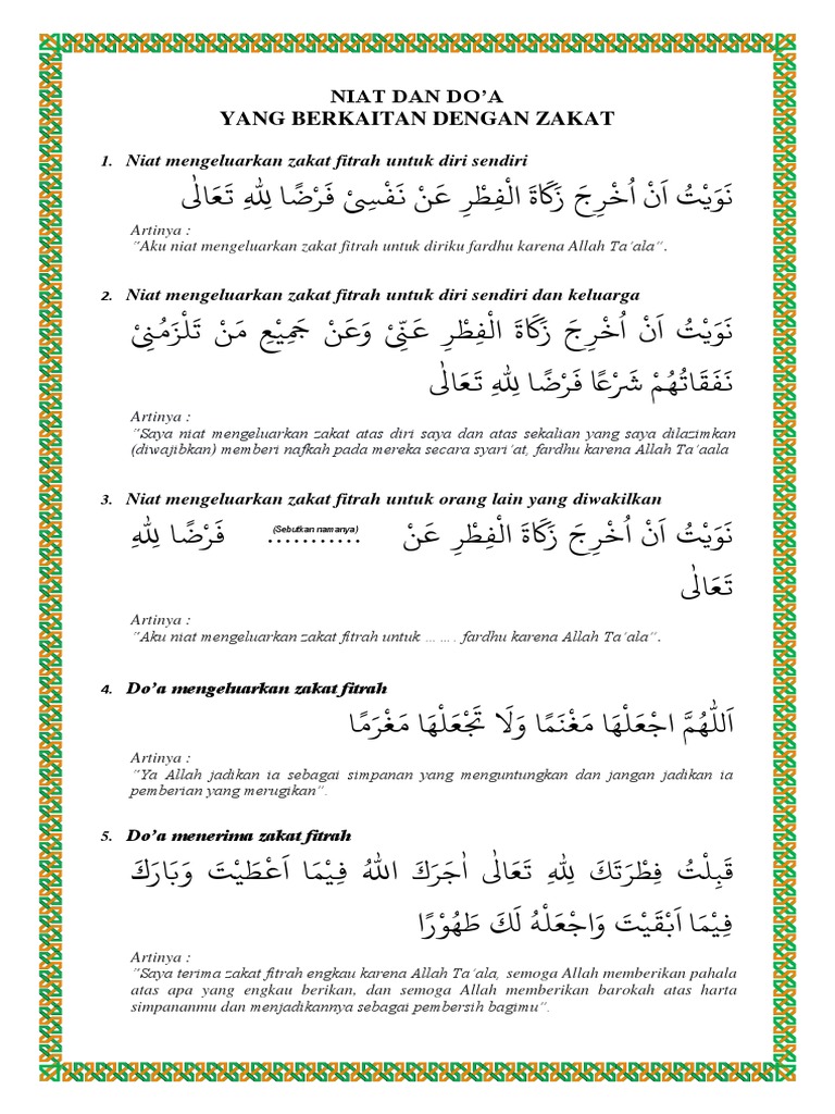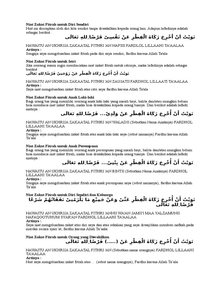Zakat untuk membantu orang miskin. Diniatkan untuk membayar zakat fitrah yang dibayarkan untuk diri sendiri. Adapun besar yang harus dikeluarkan yaitu satu sha' bentuk barang yang dikeluarkan artinya: Ambillah zakat dari sebagian harta mereka, dengan zakat itu kamu membersihkan dan mensucikan mereka dan berdo'alah untuk mereka. Kalaupun terjadi halangan, islam memberikan kemudahan untuk diwakilkan oleh orang lain baik. Sebagaimana diketahui, seseorang wajib mengeluarkan zakat untuk orang lain yang berada dalam tanggungannya. Artinya,aku niat mengeluarkan zakat fitrah untuk diriku dan seluruh orang yang nafkahnya menjadi tanggunganku fardhu karena allah taala. Niat merupakan bagian dari penentu sah atau tidaknya suatu amalan. Hutang tersebut ada kalanya ia pergunakan untuk mendamaikan. Diferensiasi ini dilakukan untuk membedakannya dengan zakat mal. Aku niat mengeluarkan zakat fitrah untuk diriku dan seluruh orang yang nafkahnya menjadi tanggunganku fardhu karena allah taala. Untuk doa zakat fitrah ini belum ada referensi yang menyatakannya dengan jelas. Selain niat, membaca doa zakat fitrah merupakan salah satu syarat sah dalam menunaikannya.